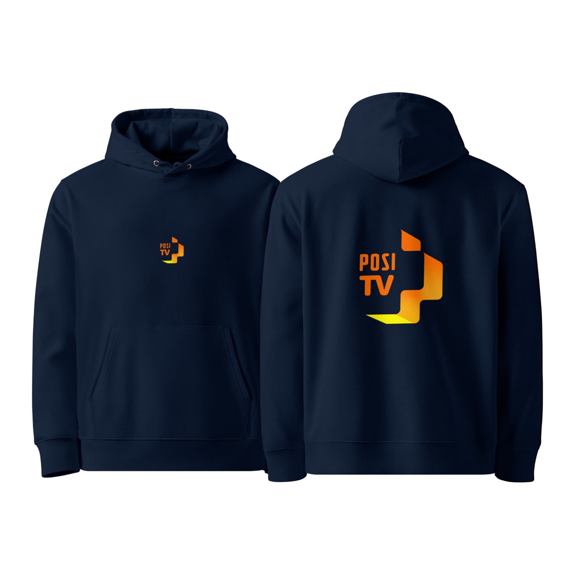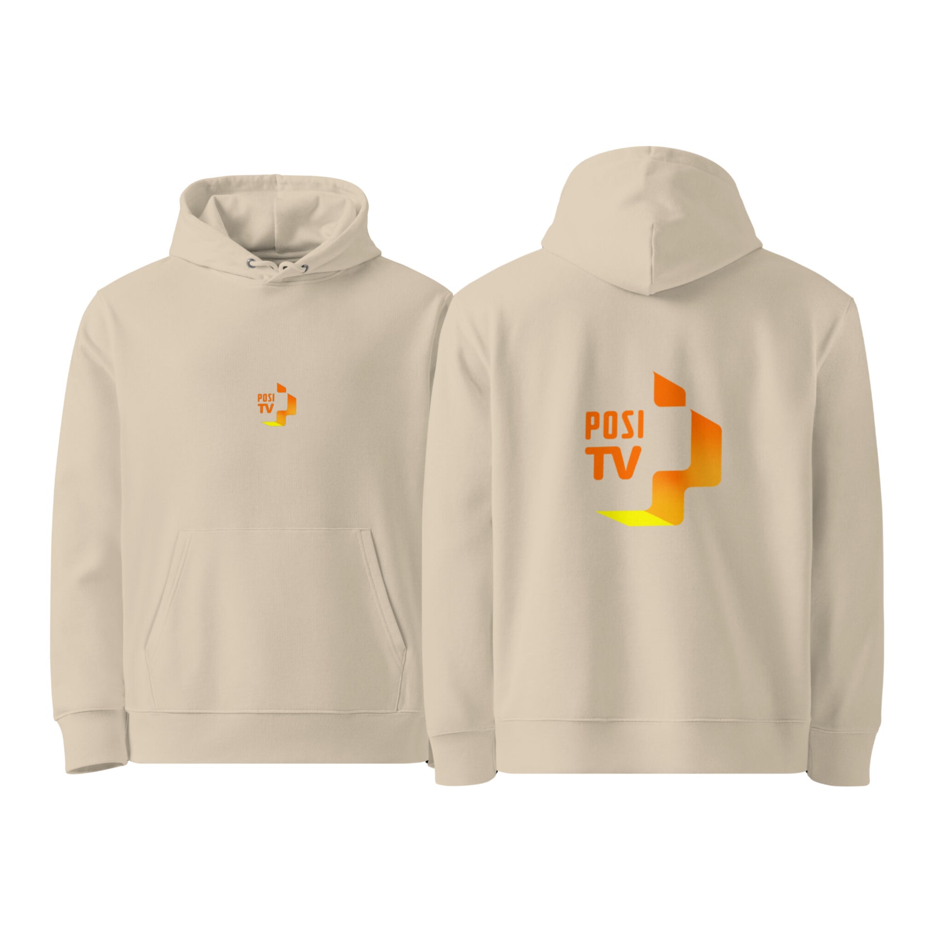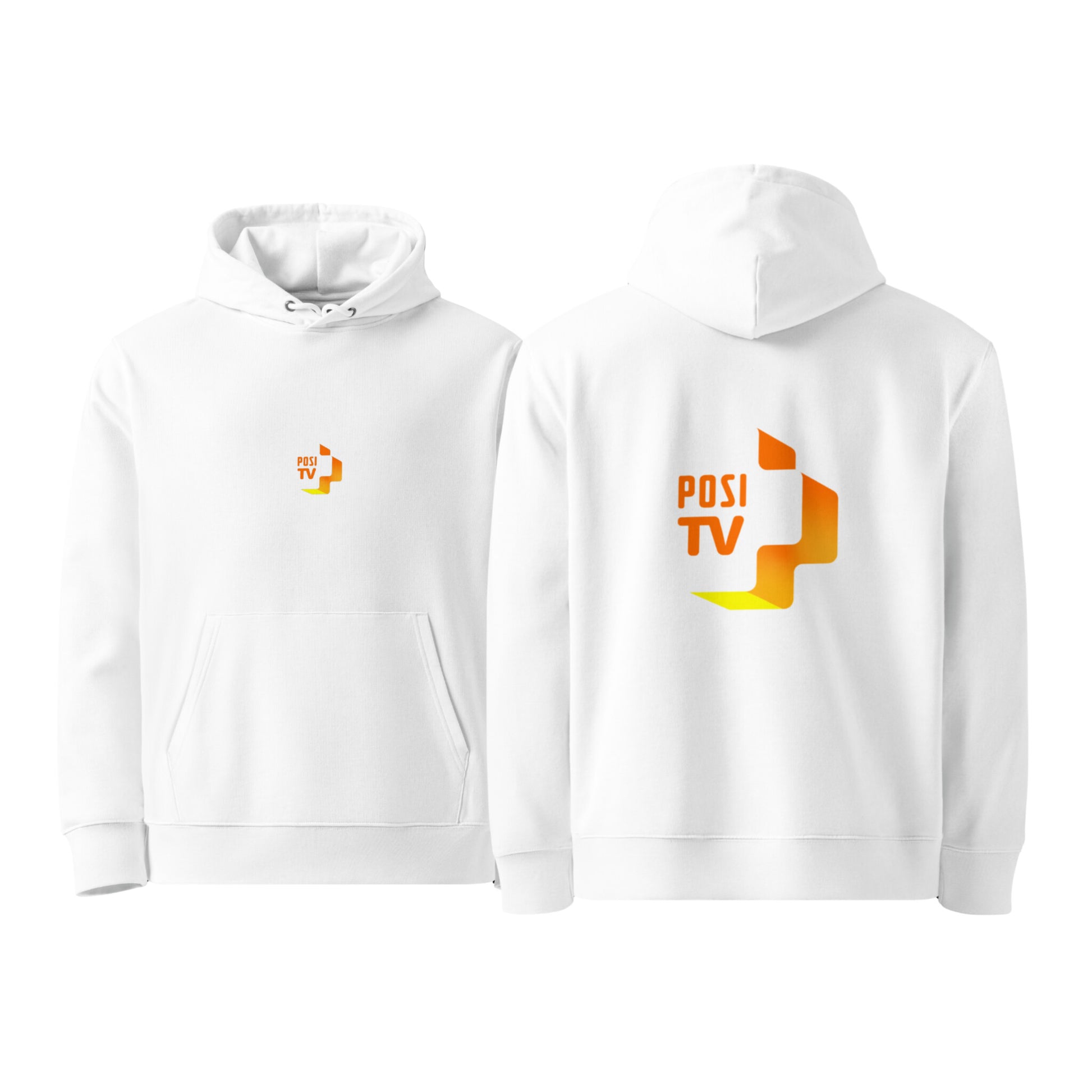 Tässä mallissa Posi Tv:n oranssi logo on painettu molemmille puolille hupparia. Pienempi logo edessä keskellä ja keskikokoinen logo selkäpuolella. Selkeä ja tunnistettava ilme tekee hupparista aidon Posi Tv -fanituotteen.